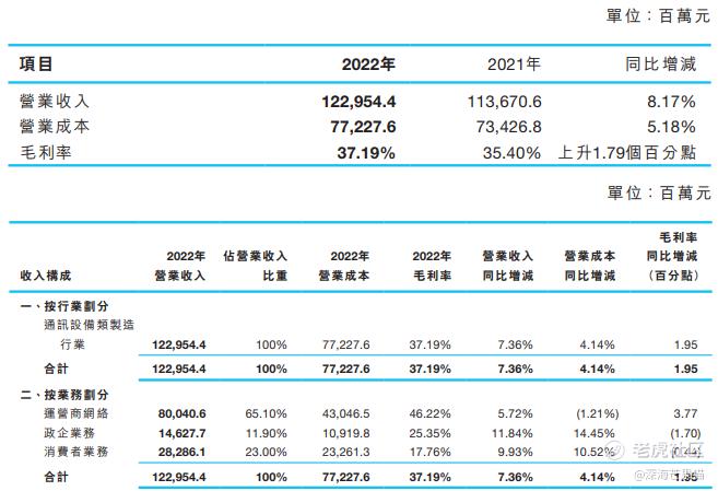 业绩数据显示,中兴通讯(00763)2022年全年营收同比增长7.36%至人民币1229.5亿元。