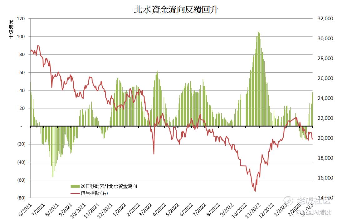 不过,另一边厢,踏入3月后,不难发现资金透过港股通(下简称「北水」)吸纳港股情况有转趋积极迹象。事实上,若然计算过去20个交易日累计北水净流入港股涉及金额,由上月下旬录得约150亿港元净流出,到近日出现约376亿元净流入,并创去年11月底以来的新高。值得留意的是,从近两年来的表现看,当北水20日累计净流入的金额达400亿之上,恒指/港股往往对市况产生一定的承托力(图2)。