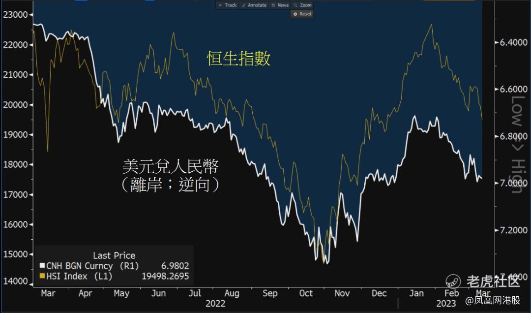 首先,随着联储局货币立场再度明显偏鹰,遂令投资者相信今年减息机会无望,甚至预期局方加息幅度较原先估计更为积极。根据利率期货显示,市场估算联邦基金利率终值利率(terminal rate)于本周初段曾飙升至约5.7%的水平,意味今年还有约1厘加息幅度,间接地推动美汇指数近日曾攀升至105.9点的今年高位,连带美元兑港元和美元兑人民币反复回升,前者再次迫近7.85弱方兑换保证水平,后者则挑战七算关口。然而,当资金回流美金、带动美元造好,往往均对港股表现带来压力(图1)。例如,过去一年以来,美元兑人民币(离岸)与恒指关连系数达-0.82甚高水平。