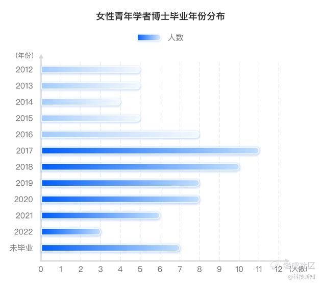据榜单显示,入围者均为博士学历,近67%的入围学者毕业于近五年,人才分布更加年轻化。以本次盘点范围的青年学者为例,毕业于2017年的学者占比最多,近14%;毕业于2018年及以后的学者占比近52.5%。其中7名专注于计算机视觉、自然语言处理领域的学者虽处于在读阶段,也已在各自领域中产出显著成果,具有较大发展潜力。人才年龄结构的年轻化,对学术领域的研究和精进起到重要作用。