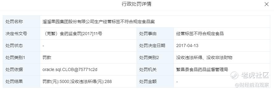 根据天眼查APP显示,2017年,溜溜果园被繁昌县食品药品监督管理局处罚,理由是生产经营标签不符合食品安全法规定的食品。