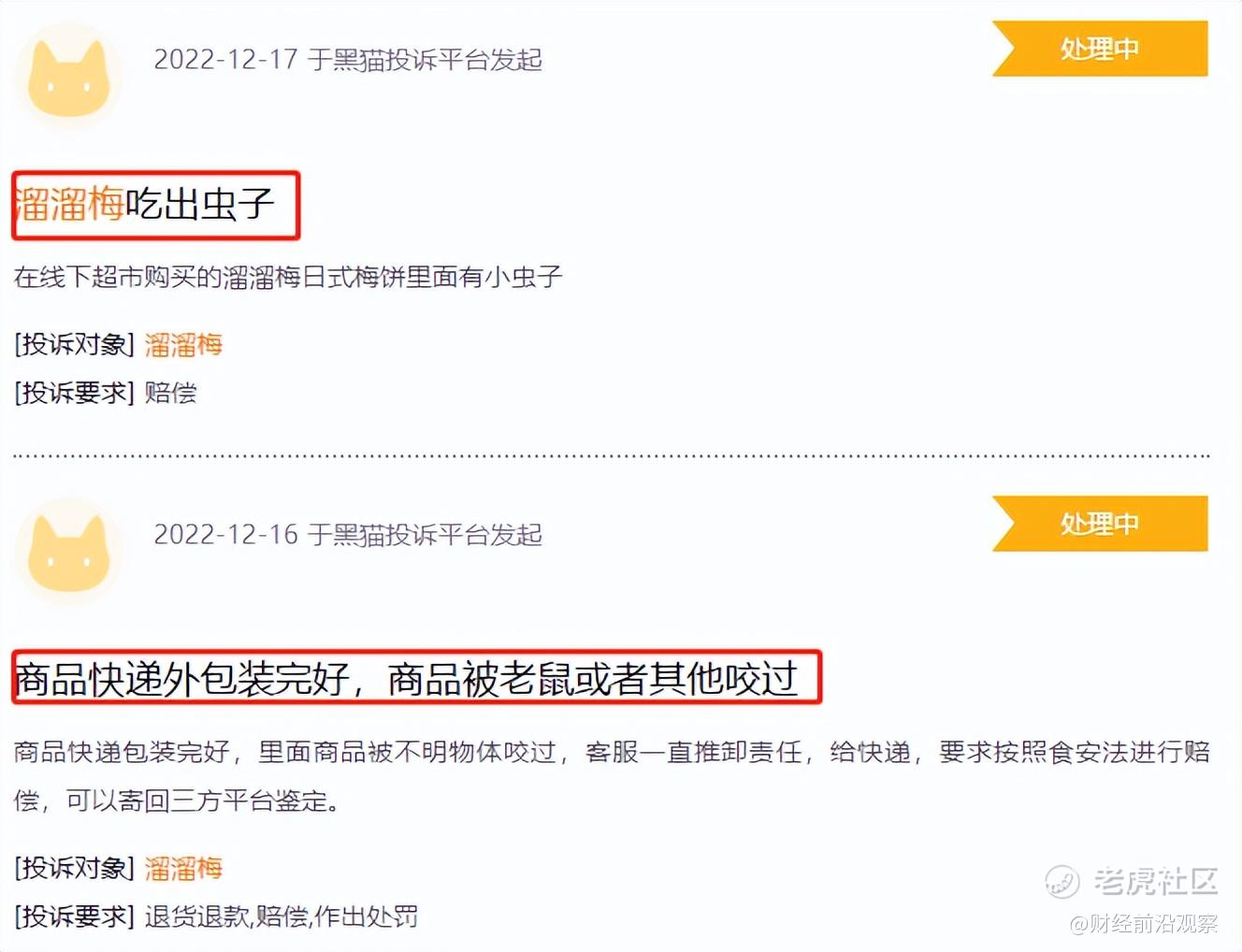 在第三方消费者投诉平台黑猫投诉上,不少消费者都表示购买的溜溜梅疑似存在质量问题。投诉原因包括但不限于包装胀气、吃出虫子、梅子发霉,甚至还有消费者表示购买的溜溜梅疑似曾被咬过。