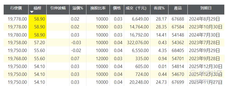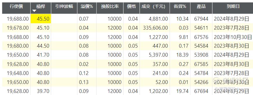 牛证成交活跃区位于收回价 19700点。收回价19700-19799水平的牛证产品有26只,杠杆在44.5倍至58.9倍,54148及67688杠杆相对较高,杠杆分别有58.9倍及58.9倍。