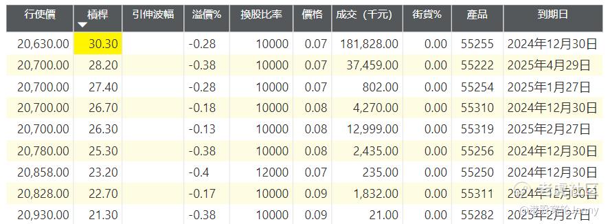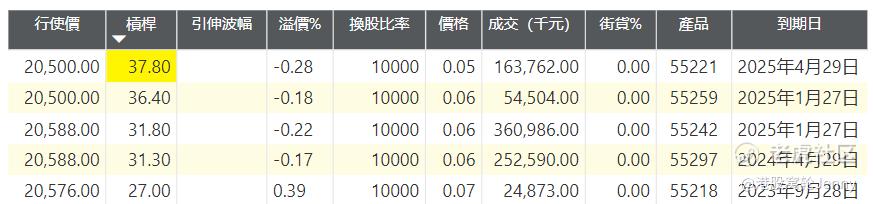 熊证成交活跃区位于收回价20500点。收回价20500-20599水平的熊证产品有9只,杠杆在27.0倍至37.8倍,55221及55259杠杆相对较高;分别有37.8倍及36.4倍。