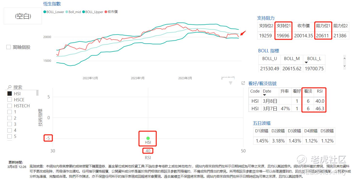 根据技术指标分析,恒指看淡指标占多;相对强弱指数 RSI 数值为40,前值46,数值反映当前位于弱势,出现下跌概率相对较大。目前位于保利加通道的下通道。预计支持位位于19696点,阻力位在20611。