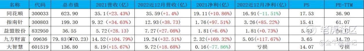 从上图可以看到,同花顺是一个流量超大的平台级APP,相信炒股的小伙伴都知道,目前总市值623.9亿人民币,PE-TTM36.9倍,增速明显处于负增长;其次是指南针,总市值199.3亿人民币,PE-TTM61.07,其增速明显处于高增长期,所以享受到更高的估值;而益盟股份在三板上市,流动性较差,总市值36.55亿人民币,PE-TTM20.12倍,公司增速一般;大智慧总市值136.8亿人民币,业绩连年亏损;而九方财富业绩是最突出的,最近几年都保持翻倍增长,营收和净利都要优于除同花顺之外的任何一家公司。