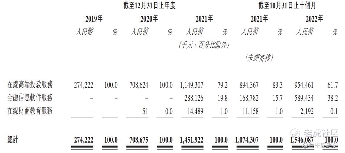 根据招股书显示:九方财富目前主要营收由在线高端投都服务、金融信息软件服务和在线财商教育服务等三项服务构成。于往绩记录2021年之前公司几乎所有收益均来自在线高端投教服务,从2021年开始,九方财富开发及推出自己的金融信息软件服务,并实现收入快速增长,彻底打破公司收入单一的尴尬局面,和在线高端投教服务形成双轮效应。