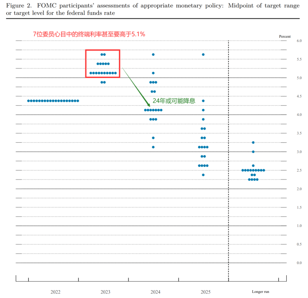 目前来看,加息进程还未结束。在去年12月的点阵图显示,预计加息终点在5%-5.25%,但市场预计,美联储最终会上调至5.25%-5.5%。