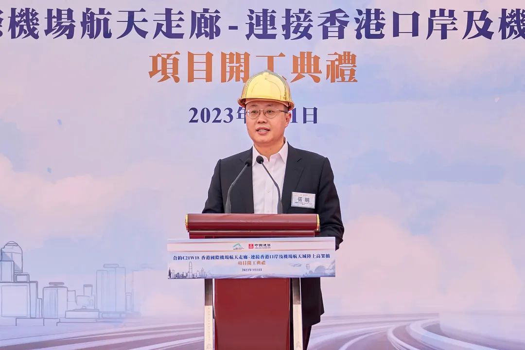 张明在致辞中首先对香港机场管理局、顾问公司、合作伙伴的通力支持与高效合作表示感谢。他表示,中建香港与香港机场管理局经过多次深入合作,已经建立了良好的合作伙伴关系。中建香港将会认真落实香港机场管理局要求,严格细致完成工程建设,全力推动“机场城市”建设。他指出,期待双方以航天走廊项目为契机,为香港国际机场保持国际领先航空枢纽地位添砖加瓦,共创美好新篇章。
