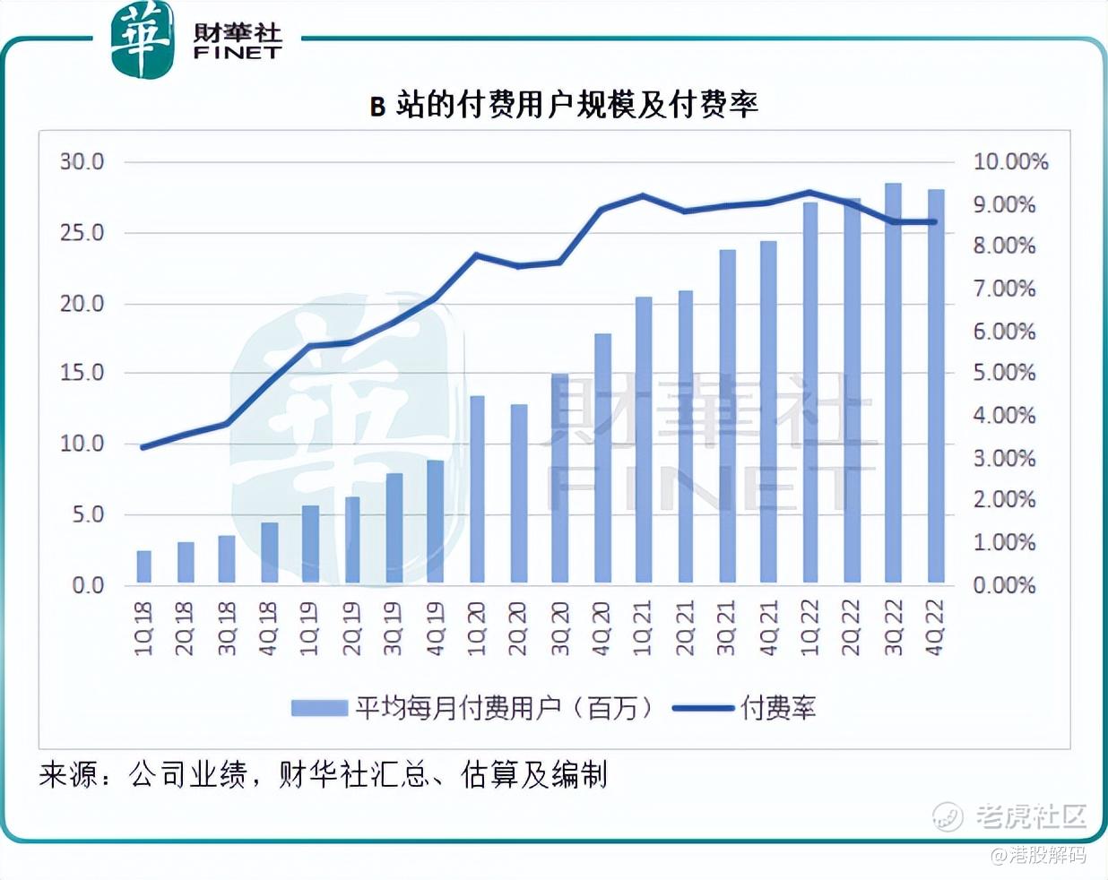 付费会员方面,2022年第4季的平均每月付费用户较上季减少0.4百万,付费率或为8.62%。见下图,其月均付费用户规模和付费率在这几个季度都停滞不前,似有见顶迹象。