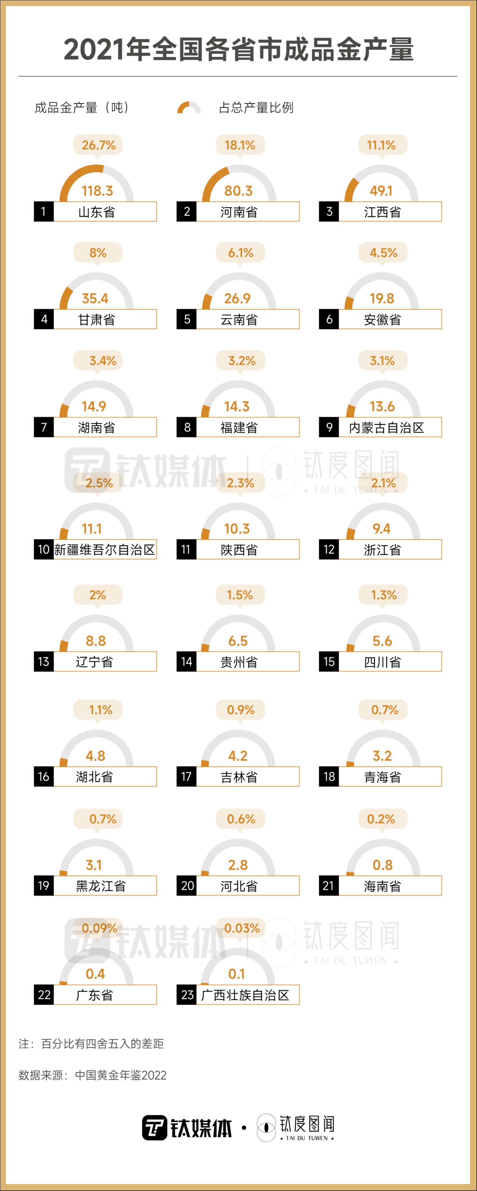 据《中国黄金年鉴2022》数据,在全国范围内,2021年,从成品金产量分布看,山东省以118.33吨的成品金年产量排名全国第一,是产金第一大省;其次,河南省、江西省分别以80.3吨、49.1吨排名第二、第三位。