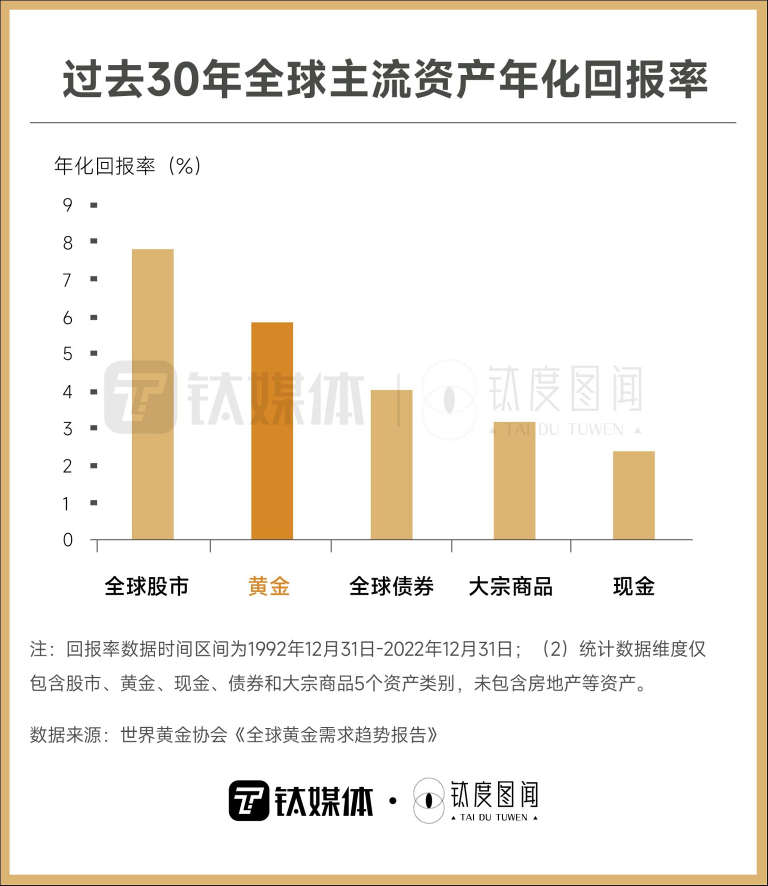 世界黄金协会报告统计了30年来全球股市、黄金、现金、债券和大宗商品这五个全球主流资产的年化回报率,从收益率来看,黄金的年化回报率为5.8%,超过了现金、债券和大宗商品等全球主流资产的同期表现。