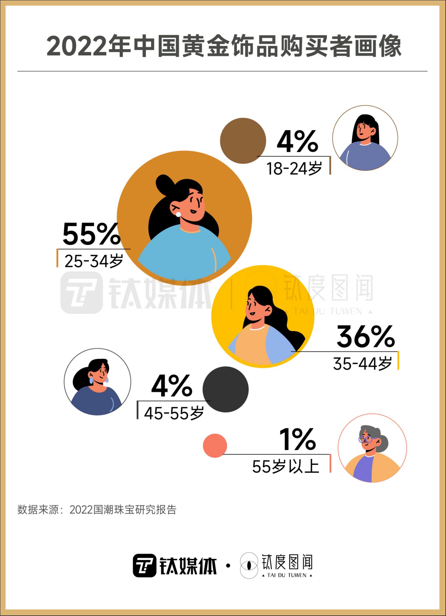 《2022国潮珠宝研究报告》显示,2021年中国内地金店主要消费人群年龄集中在25-34岁间,占比55%,高居第一;其次,35-44岁年龄层占比36%,位居第二。此外,中国黄金协会也表示,未来25岁以下的Z世代消费者将会成为黄金消费的主力。