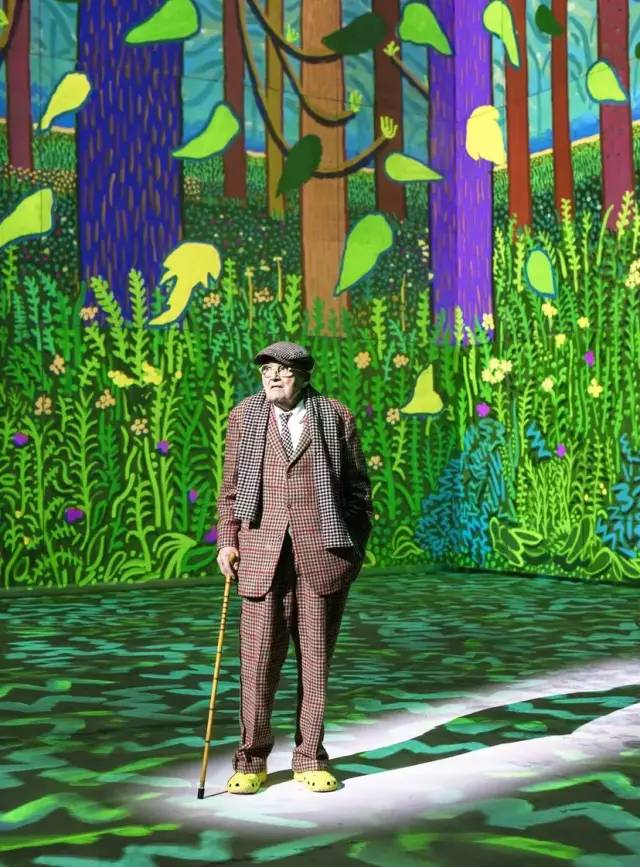 大卫•霍克尼在展览现场,摄影:Justin Sutcliffe在英国,不管是什么社会背景或年龄层,都可以找到大量霍克尼粉丝。说他是全英国最受欢迎的艺术家一点都不夸张。由于他成名已久,就像许多明星名人一样,人们常常忘记他们人性的一面。虽然没有展现任何原作,但是《更大更近(而不是更小更远)》成功地让观众接近了霍克尼这位艺术家以及这个人。在霍克尼笔下绚烂的大自然的包围中,人们会听到他的声音:“如果你看一看,这个世界是非常、非常美丽的。但大多数人都不怎么看。他们只扫描一下面前的地面以便能够行走,但他们并没有真正对事物进行令人难以置信的、强烈的观察。我有。我已经画了60年了。我还在画画。而且我仍然非常享受它。Yes。”