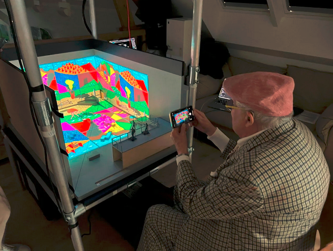 虽然测试才过几天就遭遇了全球性的疫情封闭,但是透过视频电话及电子邮件,投影剧场的结构慢慢成型,在大致内容及叙事结构定下来之后,制作团队开始将投影“动画化”。该团队将霍克尼作品一一分层,开发出属于霍克尼画风的动画。当Lightroom在场地确认之后,为了实际了解投影在空间的效果,团队同时建造了两个模型,一个模型留在伦敦办公室,另一个则是格里莫亲自开车,过英吉利海峡,送到霍克尼的诺曼底工作室。这两个模型都配有五个微型视频投影仪,让伦敦的制作团队和霍克尼的工作室能同时以1:25的比例,在建筑模型内播放投影。在接下几个月的时间,伦敦团队与戏剧导演兼桥梁剧院创始人海特纳(Nick Hytner)开始细化内容,并通过云端将最新版本发到霍克尼的工作室,让他可以下载到模型盒上播放。尽管已经85岁高龄,霍克尼一生热爱新技术,用iPad作画,用宝丽来作拼贴画,还尝试各种各样的新科技产品。他不但对这传自云端的投影档案处理的得心应手,甚至还提供注释及自己的想法,让伦敦团队来编辑。更精致的版本渐渐成型之后,美国作曲家穆赫利 (Nico Muhly)开始创作原始配乐。就像编舞家一样,穆赫利的配乐让投影开始在空间中起舞。