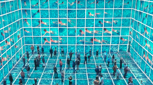 经过3年多的筹备,《更大更近》终于在2月底在Lightroom开幕。有别于传统剧场,进入Lightroom大厅之后,首先必须走下一个相当窄的小楼梯,接着穿越一条狭隘的走廊,走廊尽头有扇四周渗了光线的一扇小门,踏入这扇小门之后,豁然发现自己置身于一个充满了色彩和光影的辽阔空间,犹如一脚踩入霍克尼的《游泳池》中蓝白相间的涟漪。