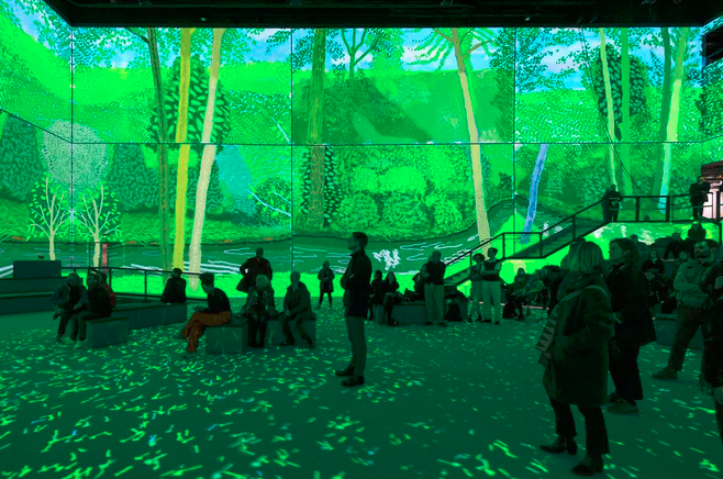 文丨宋佩芬伦敦国王十字火车站(King’s Cross) 附近,最近出现了英国艺术家大卫•霍克尼(David Hockney) 的沉浸式投影展览:《大卫•霍克尼:更大更近 (而不是更小更远)》(David Hockney: Bigger & Closer (not smaller & further away))。从梵高到浮世绘,从莫奈到弗里达•卡罗,沉浸式的投影艺术展其实已经十分普遍。我很好奇,以爱惜羽毛出名的大卫•霍克尼,为何会同意让自己作品进入此种“声色场所”?和其它同类型的展览相比,“沉浸式的霍克尼”到底有什么不同?《更大更近 (而不是更小更远)》是在Lightroom空间举行的。Lightroom 是伦敦塔桥边的桥梁剧院(Bridge Theatre) 及舞台视觉设计制作公司59 Productions共同创立的艺术兼表演空间,由Haworth Tompkins建筑事务所设计完成。59 Productions在全球各地设计策划过很多表演、活动、展览,但它们大多都是“昙花一现”,活动一结束就消失无踪。大约在4年前,公司决定寻找一个固定的空间,能够尝试新的沉浸式体验。他们很快地找到桥梁剧院作为合作伙伴,共同成立了Lightroom,由桥梁剧院联合创始人之一斯塔尔(Nick Starr) 及59 Productions常务董事斯莱尼(Richard Slaney) 共同主持。连建筑都还没定案之前,Lightroom团队就开始热烈讨论内容的设计,为了有别于市面上的沉浸式投影,Lightroom决定要与还在世的艺术家、音乐家、编舞、电影导演合作,与他们共同创作全新的内容, 斯塔尔于是建议邀请霍克尼来做开头戏。或许是Lightroom的智囊团太有说服力,一封电子邮件就让霍克尼邀请59 Productions的格里莫(Mark Grimmer) 到他位于诺曼地的工作室参观讨论。在接受BBC采访时,霍克尼解释,他虽然从没看过任何沉浸式投影,但这些艺术家都已经不在人世。“我还活着。我可以调整内容。专门为它画东西。这是我现在唯一想做的。我已经85岁了,还能活多久?我是个老烟枪,其它还有别的没的需要担心的,还有五年吗?我不知道。这就是我想做的一切。”由于当时Lightroom还没有找到固定的家,格里莫于是根据59 Productions之前做过的建筑结构,先假设视觉效果,再与霍克尼的档案团队配合,将他的作品融入实验草图中。并在2020年2月东伦敦的一栋工业建筑内做了一系列的投影试验,试探霍克尼的作品在空间内投影产生的效果,同时对图片的比例、布局和各种表面材料进行了研究。对格里莫而言,投影试验最大的收获是坐在霍克尼旁边,听他讲述创作这些作品的经历,用霍克尼的声音来配合投影的想法,就是在这个时候发生的。