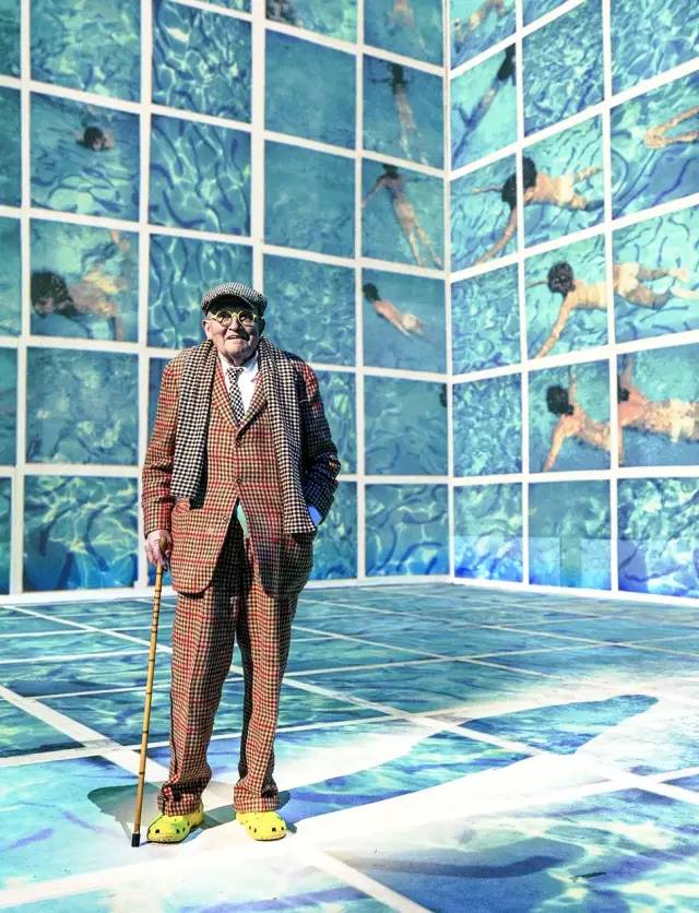 《大卫•霍克尼:更大更近 (而不是更小更远)》展览现场的装置作品:“Gregory Swimming Los Angeles March 31st 1982”© David Hockney