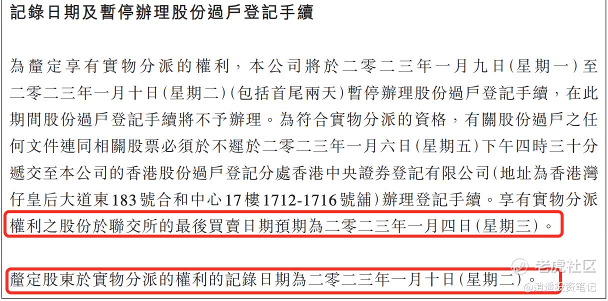 第一个红框:享有实物分派权利的最后买卖日期是1月4日,也就是1月4日持有腾讯就享有分红的权利。