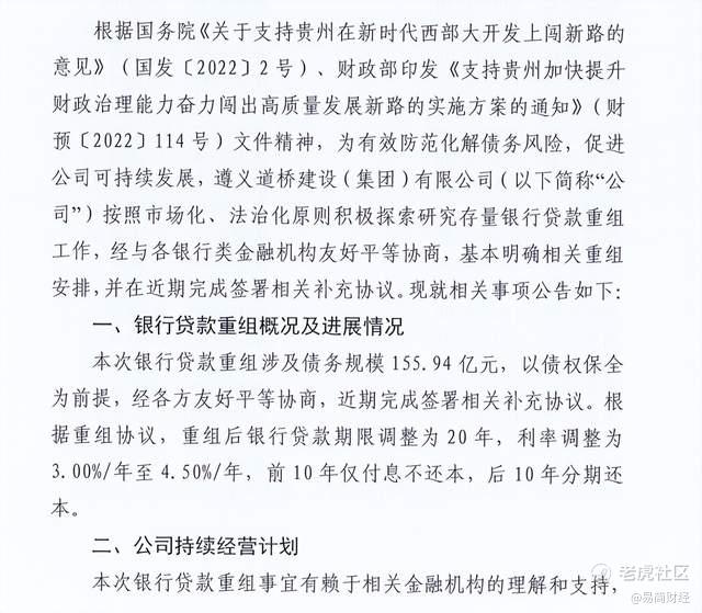 12月30日,遵义最大城投——遵义道桥建设,公布了推进银行贷款重组事项的公告。