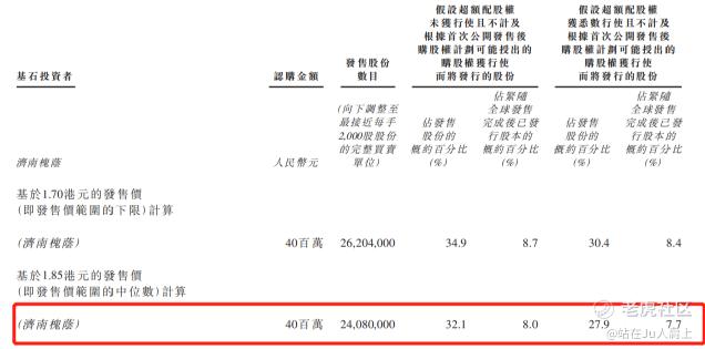 公司已与一位基石投资者济南槐荫城市建设投资集团有限公司订立协议,基石投资者认购总额约4000万港元发售股份,占比约为32.1%,假设超额配售权未获行使。禁售期六个月。