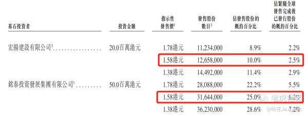 公司已与两位基石投资者宏扬建设有限公司、铭泰投资发展集团有限公司订立协议,基石投资者认购总额约7000万港元发售股份,占比约为35%,假设超额配售权未获行使。禁售期六个月。