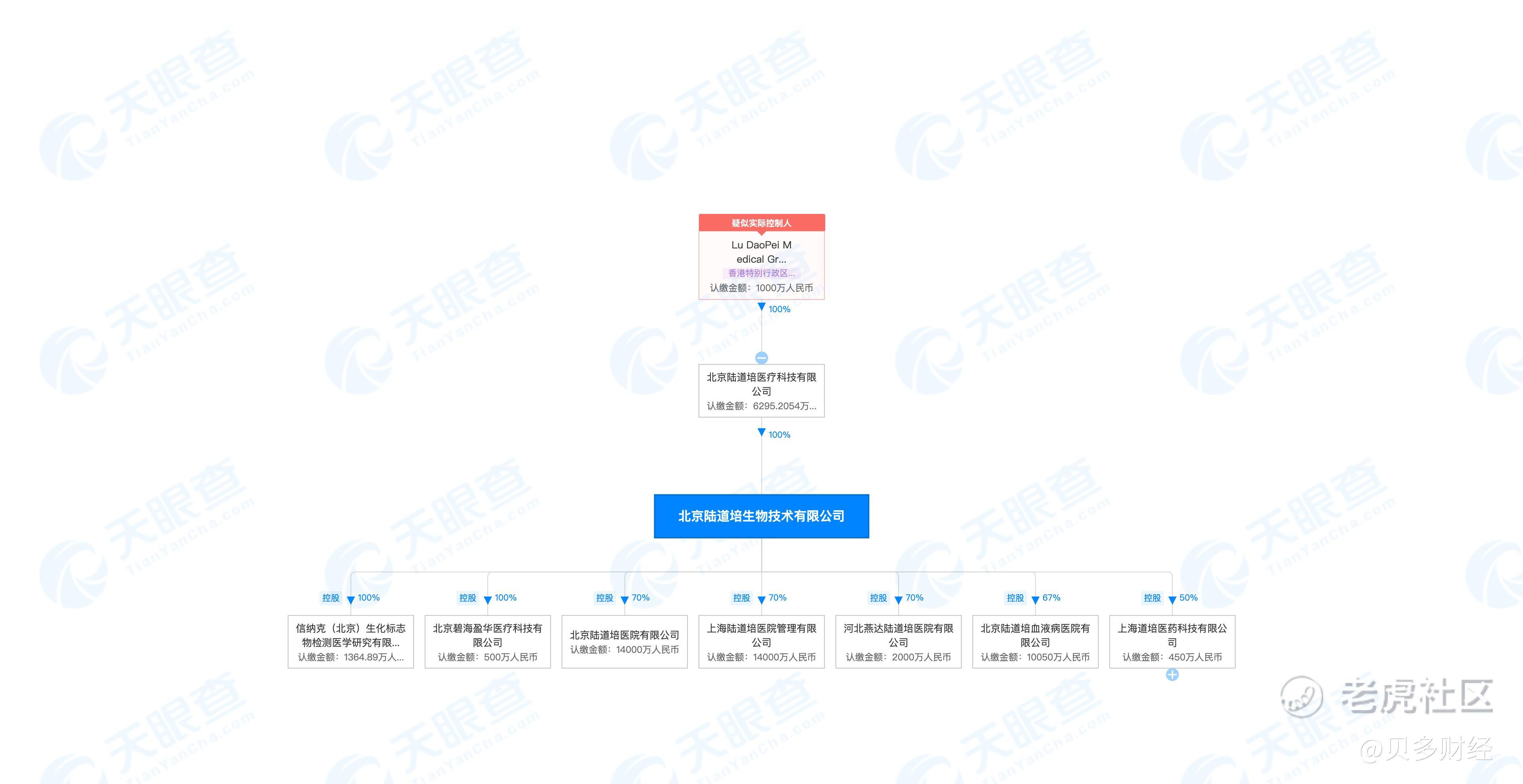 天眼查信息显示,北京陆道培生物技术有限公司成立于2012年4月,前称为“北京陆道培干细胞生物技术有限公司”。目前,该公司的注册资本为6295.2054万元,法定代表人为陆佩华,由北京陆道培医院管理有限公司全资控股。