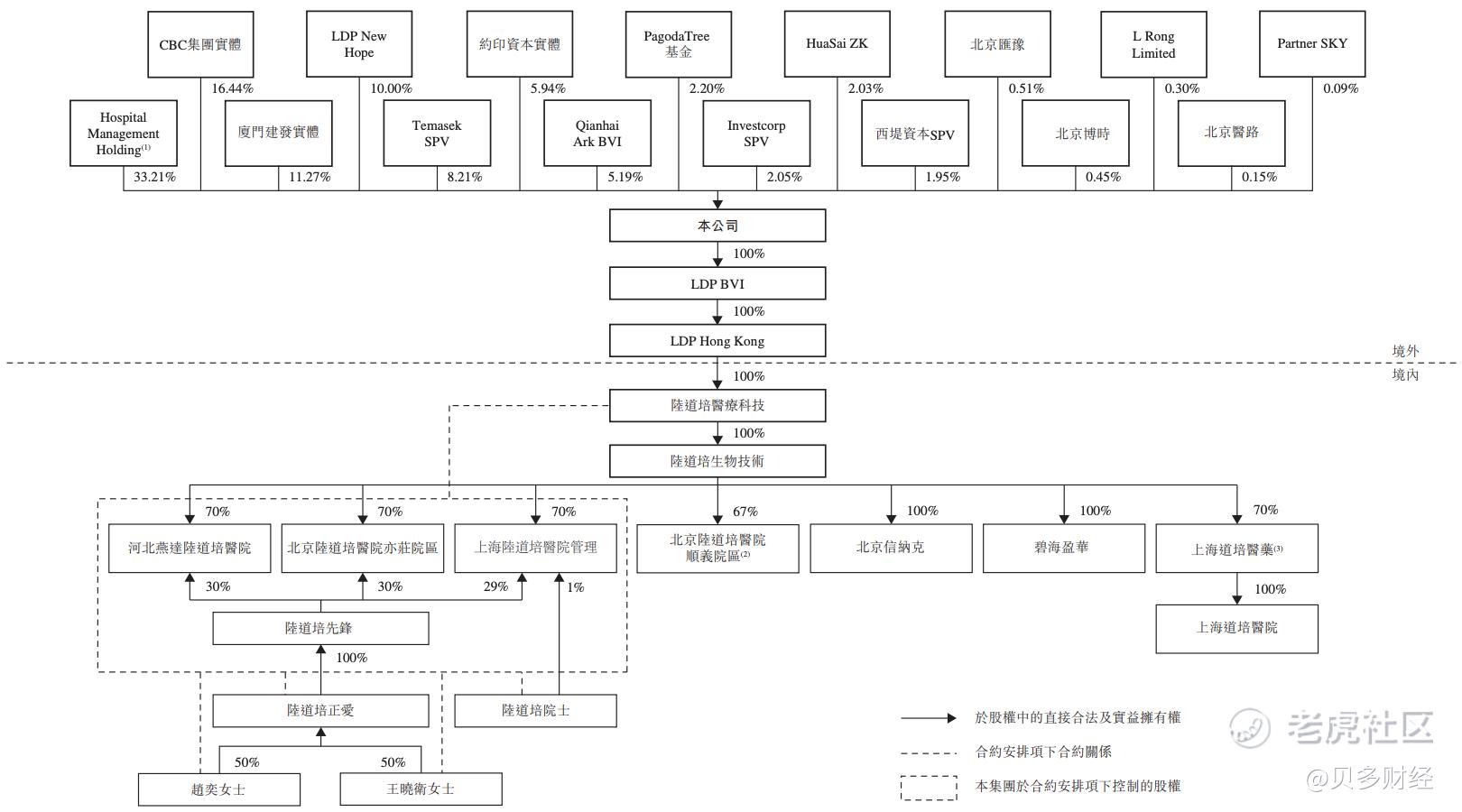 本次上市前,陆道培医疗持有可变利益实体医院70%股权,并依靠与这些医院、陆道培先锋、陆道培正爱、陆道培、赵奕及王晓卫的合约安排控制这些医院其余30%股权,以在中国提供限制外商投资的血液病医疗服务。