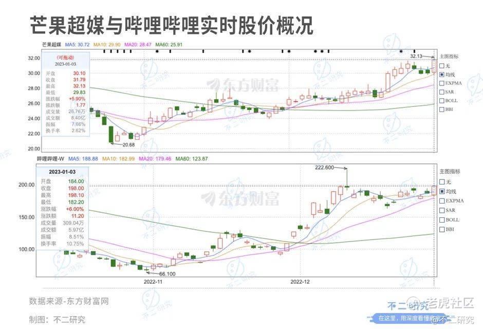 截至1月3日收盘,芒果超媒股价报31.79元/股,涨5.90% ,对应市值594.7亿元;B站报收198.00港元/股,涨6.00%,对应市值779.8亿港元(折合人民币689.53亿元)。