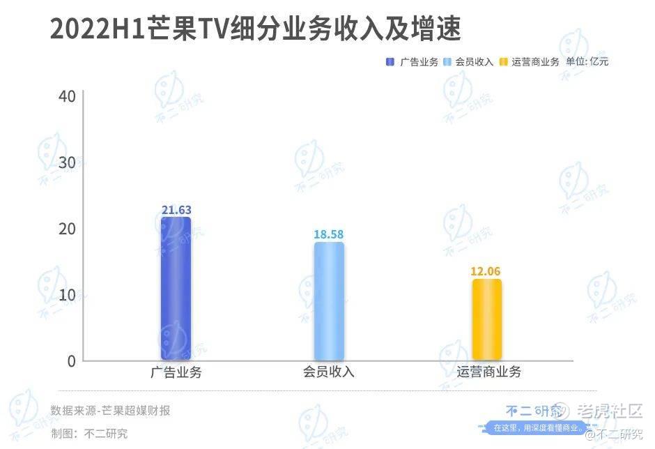 从半年报披露的最新数据来看,2022上半年芒果TV贡献营收52.27亿元,在总营收中的占比达77.85%。在芒果TV的细分业务中,广告业务占比尤多,实现收入21.63亿元,同比减少31.16%;会员收入18.58亿元,同比增长6.48%;运营商业务实现收入12.06亿元,同比增长19.31%。