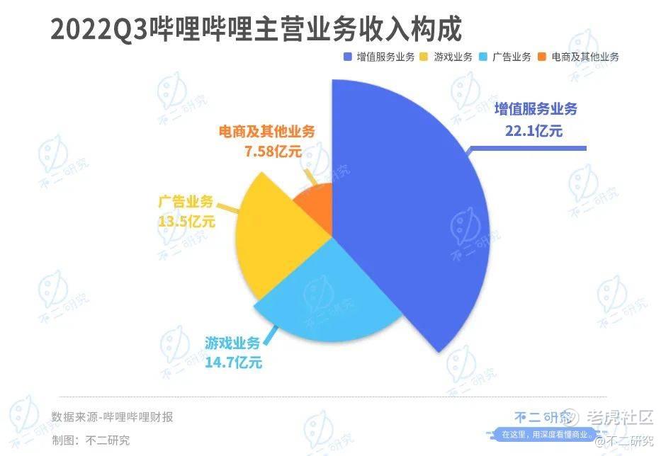 B站的营收结构也十分多元,涵盖四大业务:增值服务、游戏业务、广告业务和电商业务。三季报显示,增值服务业务收入为22.1亿元,同比提升16%,主要来自于大会员和直播打赏分成;游戏业务收入14.7亿元,同比增长6%;广告业务13.5亿元,同比增长16%;电商及其他业务收入7.58亿元,同比增长3%。