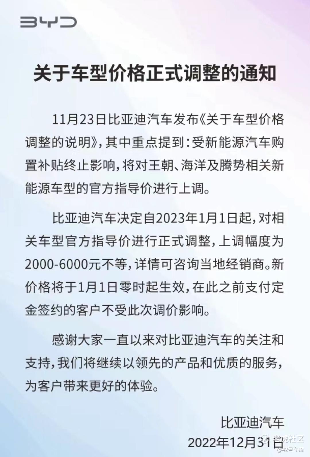 比亚迪官方重复发布了在 2022 年 11 月 23日发布过的涨价声明,自 2023 年 1 月 1 日起,由于国家新能源补贴的终止。各车型价格上调 2,000-6,000 元不等。