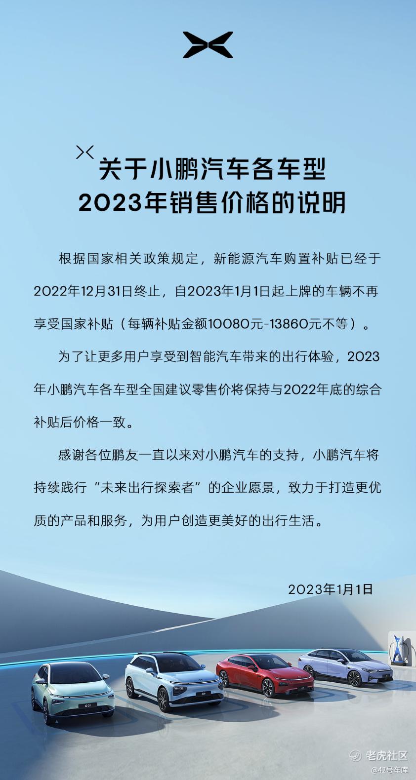 小鹏官宣的价格变化是由于 2022 年 12 月 31 日结束的国家补贴产生的差价,小鹏选择将现有车型的售价保持与 2022 年补贴后的价格一致,维持用户购车的到手价格。