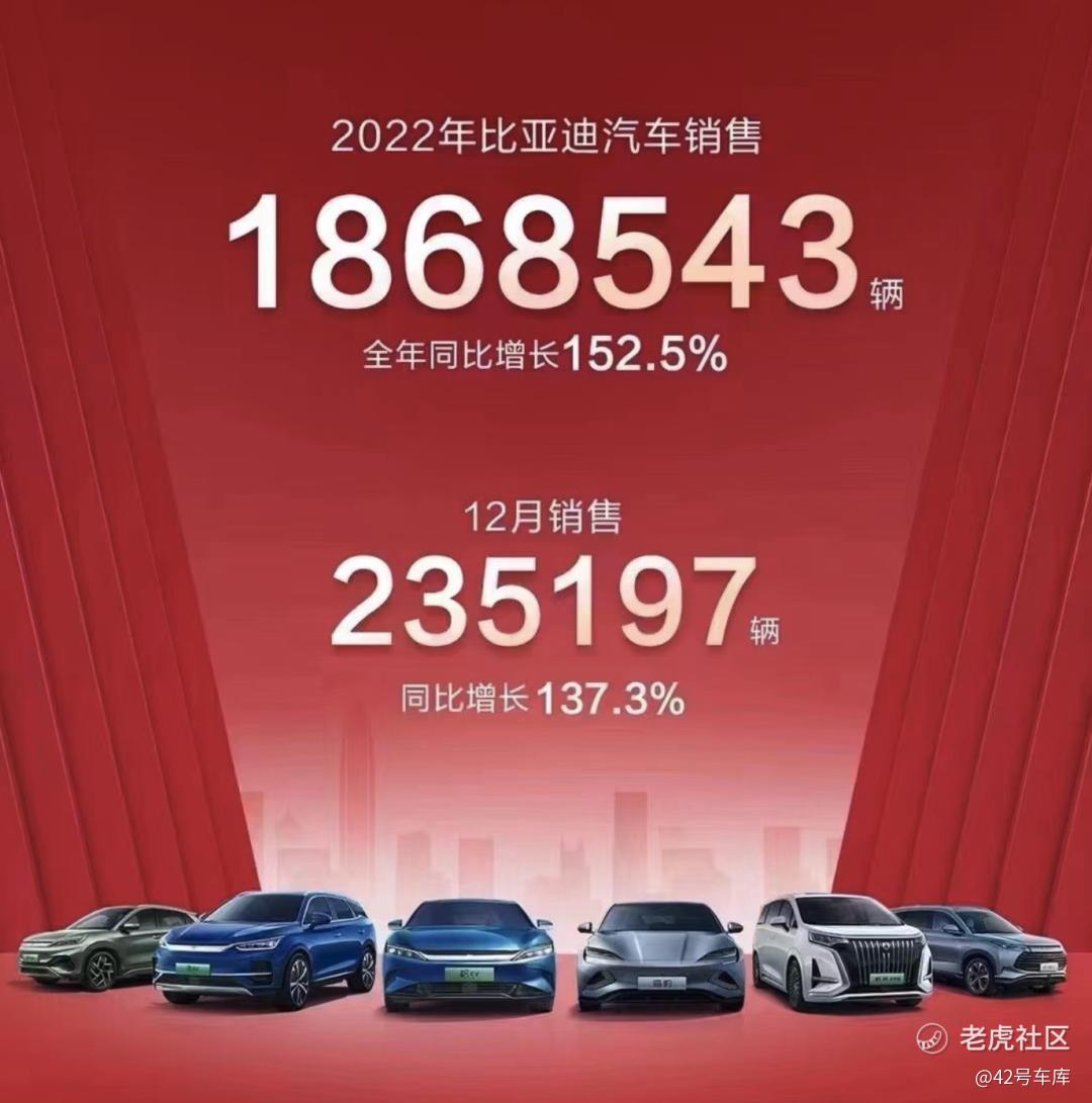 比亚迪 2022 年 12 月销量公布,为 235,197 辆。其中纯电动车为 109,577 辆,插电混动车为 125,039 辆。