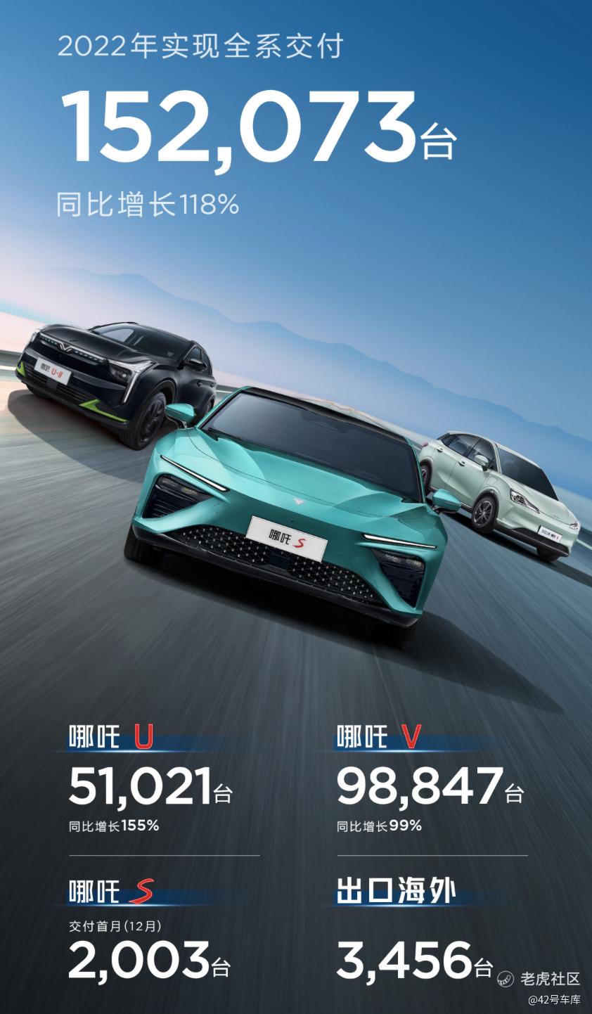 其中全年交付量为 152,073 辆,出口 3,456 辆;哪吒 U 交付 51,021 辆,哪吒 V 交付 98,847 辆,哪吒 S 12 月交付 2,003 辆。