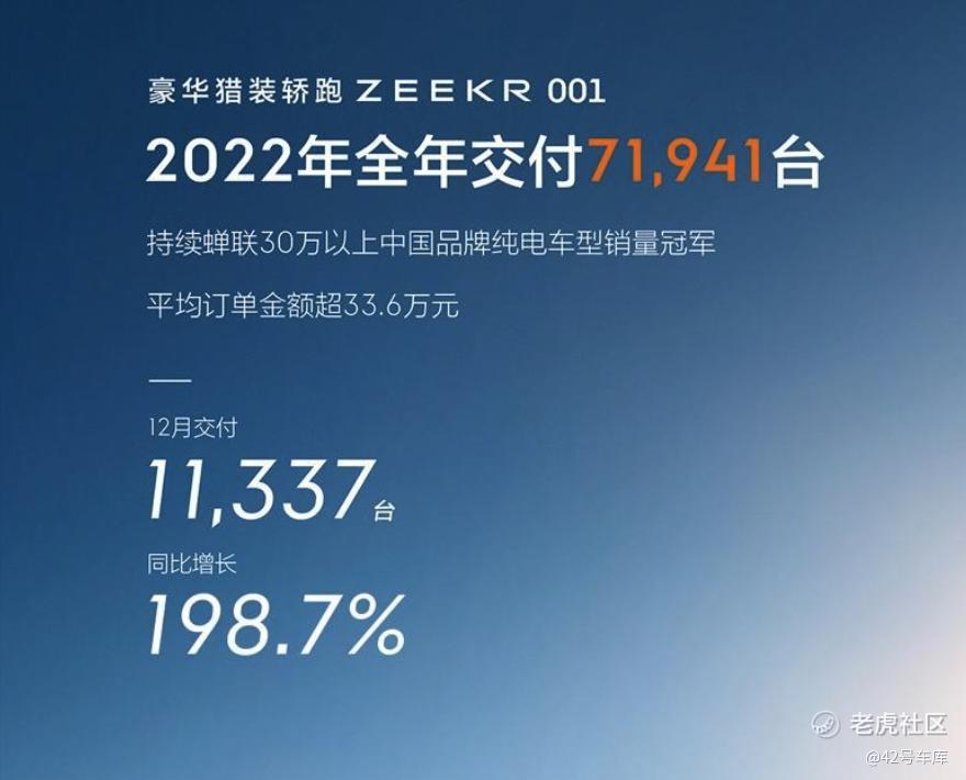 极氪 2022 年 12 月交付达到 11,337 台,同比增长 198.7%,全年交付 71,941 台。