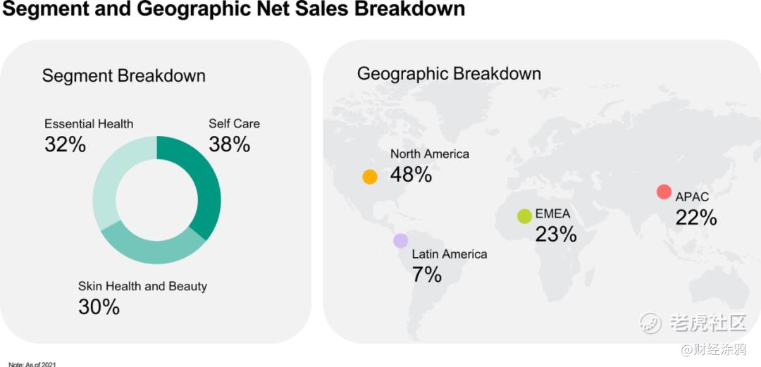 第三块业务则为基础健康板块,营收占比32%,包含伤口护理、口腔护理、婴儿护理和女性健康品牌,有李施德林、创可贴绷带、OB卫生棉条及包括婴幼儿护理品牌Vivvi & Bloom在内的12个品牌。