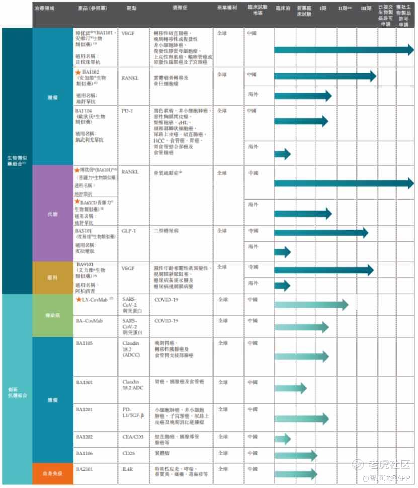 从研发管线来看,公司有三种核心产品(即BA6101、BA1102及LY-CovMab)以及11种其他药物或候选药物,包括:已于中国商业化的产品博优诺®(BA1101);三种于中国处于III期临床试验的候选药物;七种处于不同开发阶段的其他候选药物。上述候选药物的其中两种(即BA6101及BA1102)在欧盟进行I期临床试验。