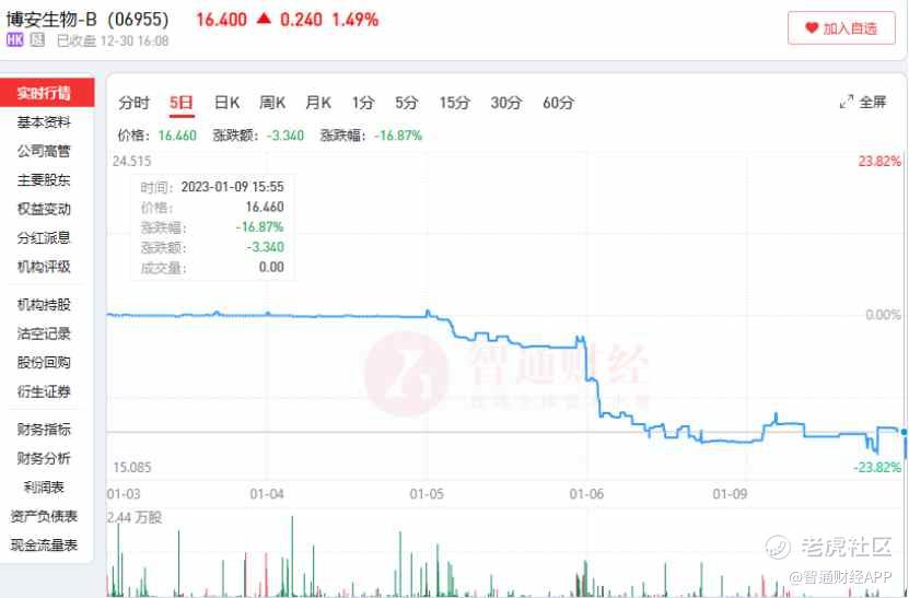 1月9日,博安生物-B(06955)$博安生物-B(06955)$ 早盘股价最高触及17.0港元,涨幅达到5.2%。这也意味着,其股价在此基础上再增长约16.5%,便可达到发行价19.8港元。然而当日午盘后,博安生物的股价便转头向下,直至收盘涨幅已收缩至2%以内。