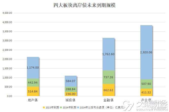 2023年四大板块离岸债到期规模共计约1824.78亿美元,相较2022年而言规模小幅收窄,地产板块仍有514.84亿美元债券到期,由于境外融资渠道仍处于冻结状态,房企需要通过自有资金或其他融资来偿还境外债务。