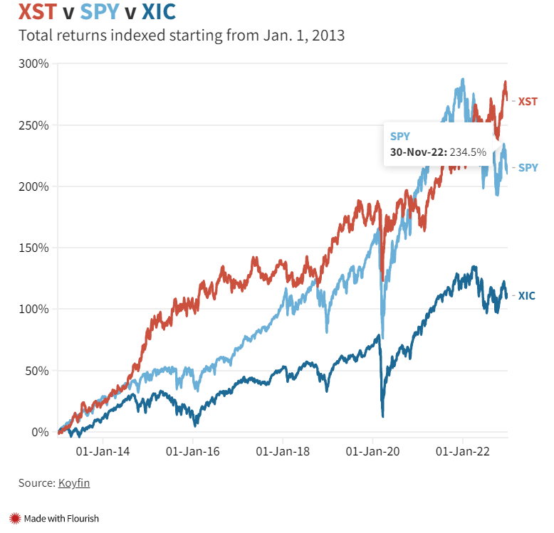 2022年,当加拿大和美国基准指数下跌时,该基金上涨超过10%。同样,在 2018 年全球市场因美中贸易战中中国经济放缓的担忧而下跌时,XST 基金的回报率为 1.8%。