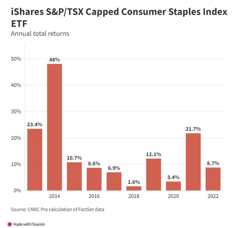 iShares S&P/TSX Capped Consumer Staples Index ETF(股票代码 XST)是 CNBC Pro 筛选的全球近 7,000 只股票 ETF 中唯一一只在 2013 年 1 月 1 日至 2022 年 12 月 31 日期间没有出现负回报的基金.根据数据分析工具 Koyfin 的数据,这只在多伦多证券交易所交易的 ETF 同期为投资者提供了 14% 的复合年增长率——明显高于更广泛的指数跟踪基金。