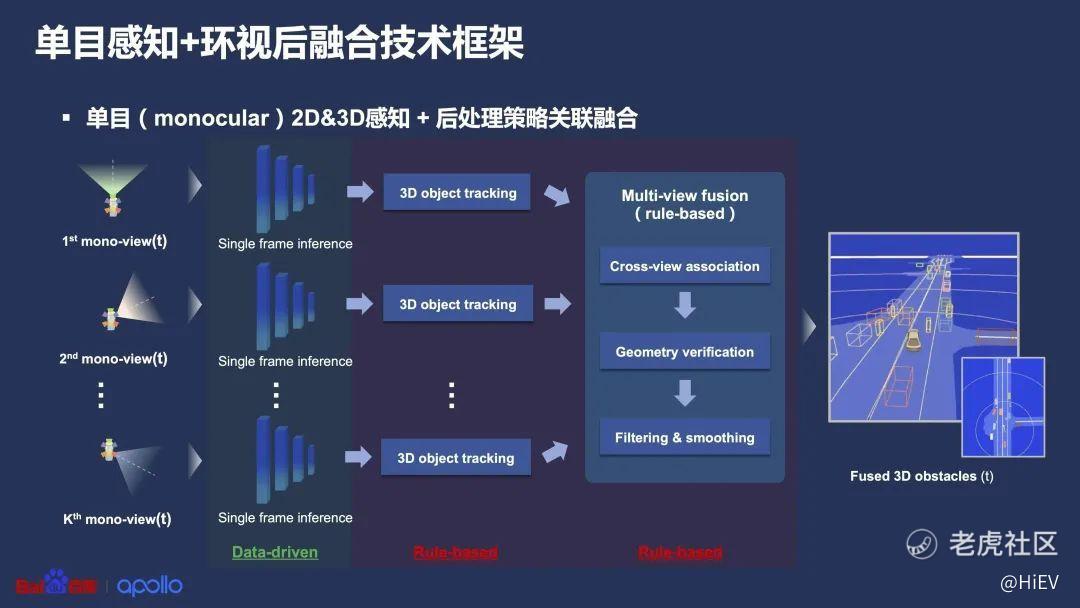 百度之前就是用的传统的方式,上面这张图表示的是一个单目摄像头,再加上多个环视摄像头的后融合技术。