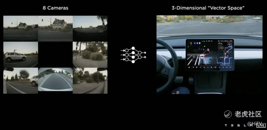 每一个不同朝向的相机,会各自先经过一个神经网络去推理出周围的障碍物位置、大小、朝向等信息,然后再把他们拼在一个3D空间里。
