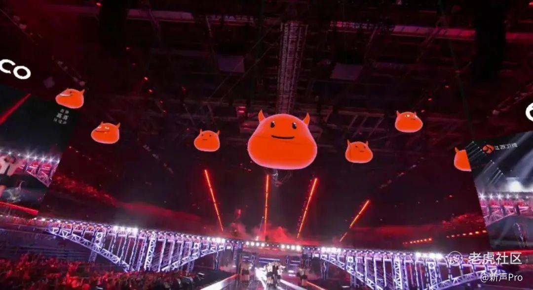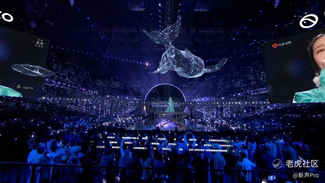 在跨年期间,PICO联合2023江苏卫视跨年演唱会推出了VR直播。不同于李玟演唱会的全虚拟呈现,这场VR直播是现场舞台呈现与定制VR舞台特效的结合。在李宇春演唱《周末愉快》时,舞台上空会飘浮起VR特效红色牛牛,伴随着歌声缓缓跃动。谭维维表演时,舞台上方会有一条透明蓝钻形态的鲸鱼遨游和跃起。