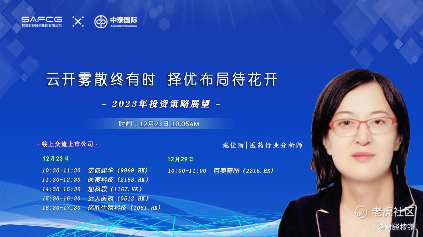 2022年已接近尾声,随著全球政治经济格局不断变动与国内疫情形势逐渐好转,广大投资者对2023年市场各版块的修复普遍持乐观展望。新的经济与政策形势下将带来何种投资机遇?本次智盟财经顾问集团联合中泰国际聚焦港股医药板块,成功举办“2023年港股医药行业投资策略分享会”,会议邀请到中泰国际医药行业分析师施佳丽女士分享港股医药行业动态与机遇,同时,来自诺诚健华(9969.HK)、医渡科技(2158.HK)、加科思(1167.HK)、远大医药(0512.HK)、亿胜生物科技(1061.HK)、百奥赛图(2315.HK)6家上市公司高管也在会议中介绍了公司经营状况与最新资讯,为广大投资者带来丰富的投资信息。