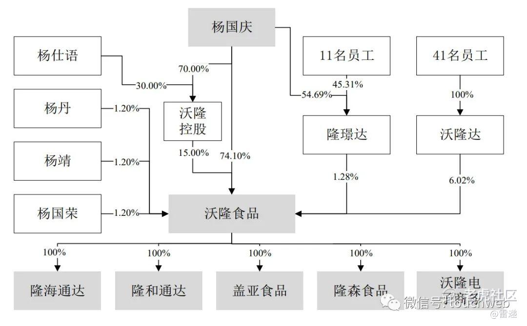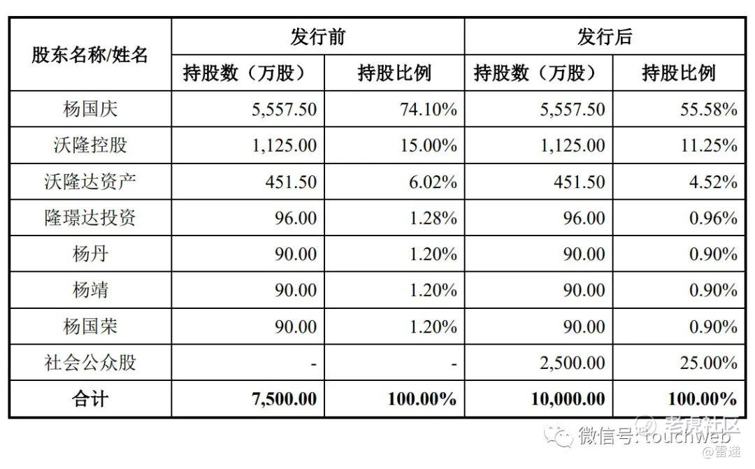 IPO后,杨国庆持股为55.58%,沃隆控股持股为11.25%,沃隆达资产持股为4.52%,隆璟达投资持股为0.96%,杨丹、杨靖、杨国荣分别持股为0.9%。