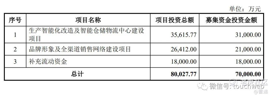 其中,3.1亿元用于生产智能化改造及智能仓储物流中心建设项目,2.1亿元用于品牌形象及全渠道销售网络建设项目,1.8亿元用于补充流动资金。