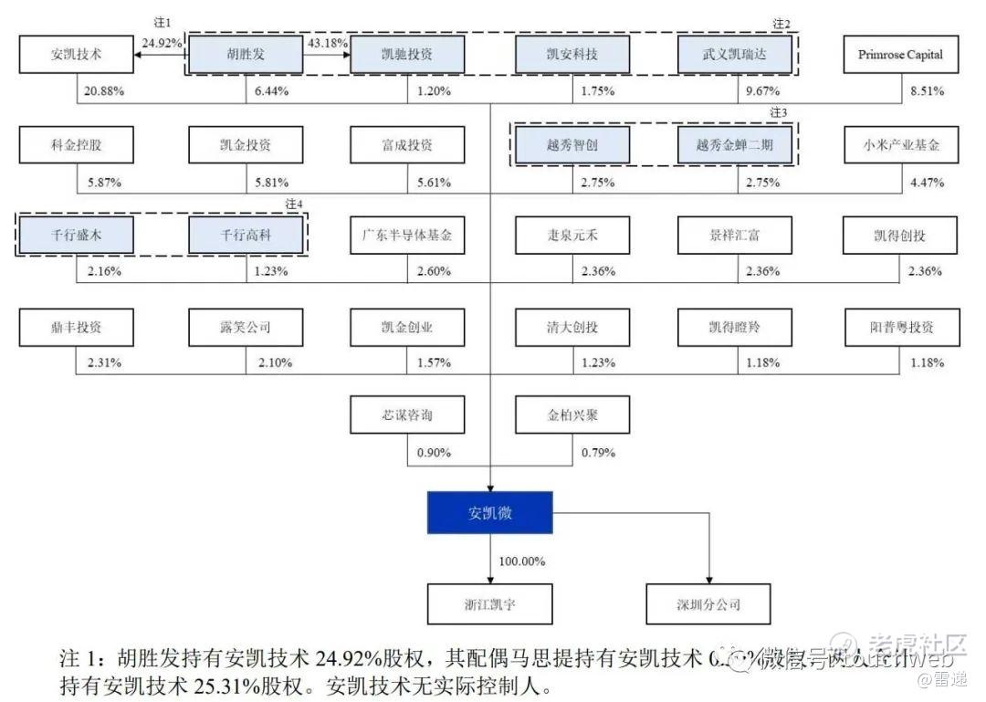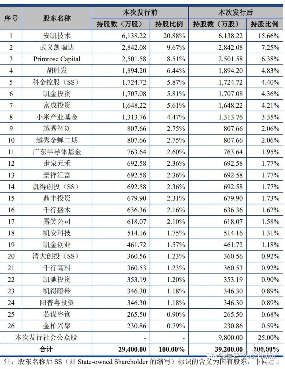 IPO后,安凯技术持股15.66%,武义凯瑞达持股7.25%,Primrose Capital持股6.38%,胡胜发持股为4.83%,科金控股(SS)持股4.4%,小米产业基金持股为3.35%。