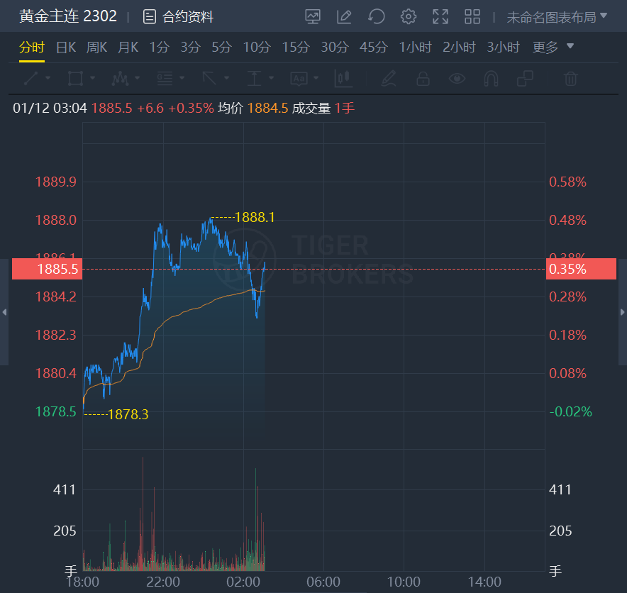黄金期货日内走高,现涨0.35%,报1885.5美元/盎司。